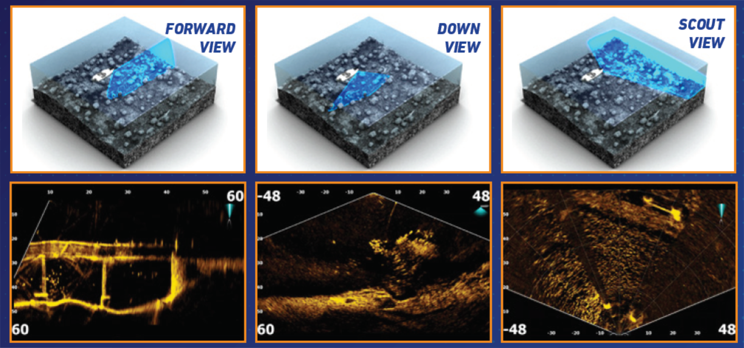 Ryby a prezentáciu svojej nástrahy sledujete pomocou pohľadov s vysokým rozlíšením pred alebo pod loďou, alebo použite režim Scout, aby ste videli ultraširoký pohľad zhora na štruktúru vody a aktivitu rýb pred vašou loďou.