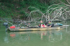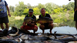 Rieka bola široká cca 150m. Po celom toku boli krásne miesta a rozmanité dno, kde sa hýbala hĺbka od 1m do 20m a všade boli popadané stromy. Krásne lesy lemovali brehy a sem tam označené úseky, ktoré boli zamínované. Dno bolo štrkovo pieskové, miestami boli pod vodou piesočne duny cca 3m vysoké, ideálne útočisko pre ryby. Po pol hodine sme dorazili na miesto a začalo sa vybaľovanie, ktoré bolo nekonečné a to bolo celkom teplo. Už som sa tešil, kedy konečne nahodím a trochu si oddýchnem. Všetko sa podarilo ešte pred tmou. Nahodil som overenú kombináciu, čo mi funguje na Slovensku. To sa mi aj osvedčilo. Žiaľ nepodarilo sa nám vytiahnuť rybu. Jedine dvoch pleskáčov, ktorí mali cez 55cm- krásne kusy. Boli aj pekné jazdy, ktoré sme zasekli, ale kvôli prekážkam vo vode sa nám nepodarilo rybu vytiahnuť. Sprievodca nám dal pár rád, ako chytať na danej vode, keďže je domáci a vie lepšie ako to tu funguje. Tak sme dali na jeho radu. Nasledujúci deň sme naložili veci na čln a rozhodli sme sa, že sa bude loviť z člna. Zapožičal nám svoj upravený čln, kde nebol problém uložiť 6prutov a dve lehátka. Presunuli sme sa asi o 1 km proti prúdu. Miesto bolo dopredu zakŕmené. Po príchode sme hneď chytili pár kapríkov, síce menších do 5kg. Na vode sme strávili celý deň. Na večer sme prišli na breh sa najesť a pripraviť na noc. Po jedle sme hneď vyrazili späť. Noc priniesla pár záberov, ktoré sa po záseku nepodarilo premeniť do úspešného konca.