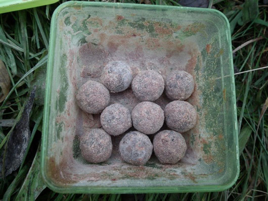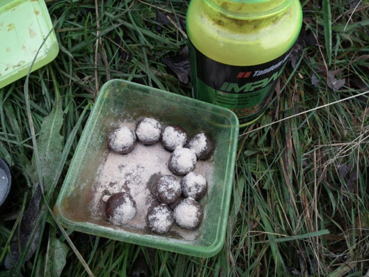 Po nadipovaní boilies následne zasypeme práškovým dipom, použitá príchuť je zasa na fantázii. Nádobu uzavrieme a potrasieme, aby sa nám boilies obalilo.