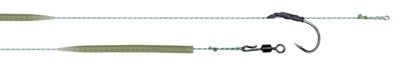 Hrôzostrašne vyzerajúci, ale verte mi ,veľmi úspešný nadväzec, ktorý v každom prípade sedí na sto percent. Háčik z dlhým a ohnutým ramienkom jednoducho prevlečte cez očko obratlíka a poistíte silikónovou zarážkou. Ďalším krokom je navliecť oceľový krúžok ku ktorému pripevníme boiles už opísaným spôsobom a zaistíme ďalšou zarážkou. Ako vidíte jednoduché ,ale naozaj parádne. Z spletených šnúr môžete vyberať podľa vlastného gusta, ale prečo by ste nemohli skúsiť Lead Core?